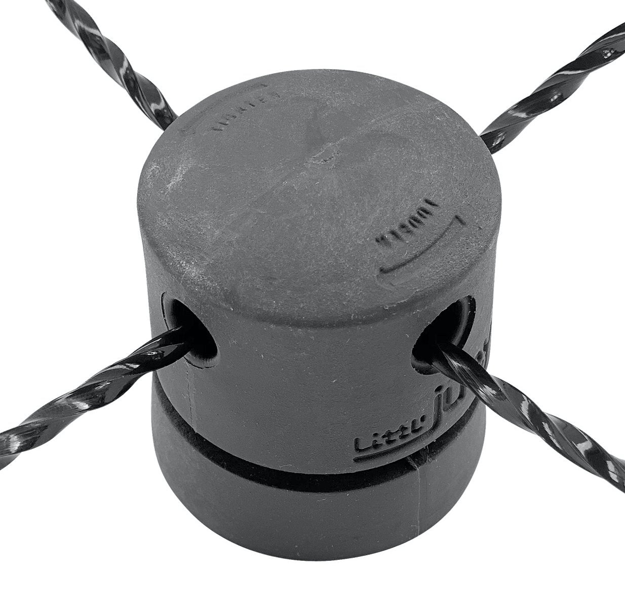 Your high performance Littl' Juey cutting head consists of two parts that assemble together within seconds to contain pre-cut strips of cutting line. The parts fasten together on a large thread which enables the top part of the head to be easily adjusted 90 degrees for insertion of new reloads; rotation of the trimmer head tightens the strips of line within the assembly during use.